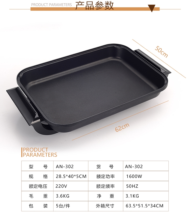 貨號(hào):AN-302 規(guī)格:40*28.5*5cm(內(nèi)部尺寸) 型號(hào):AN-302 功率:1600W 電壓:220V/50HZ 外箱尺寸:63.5*51.5*34cm 毛重:3.6kg 凈重:3.1kg